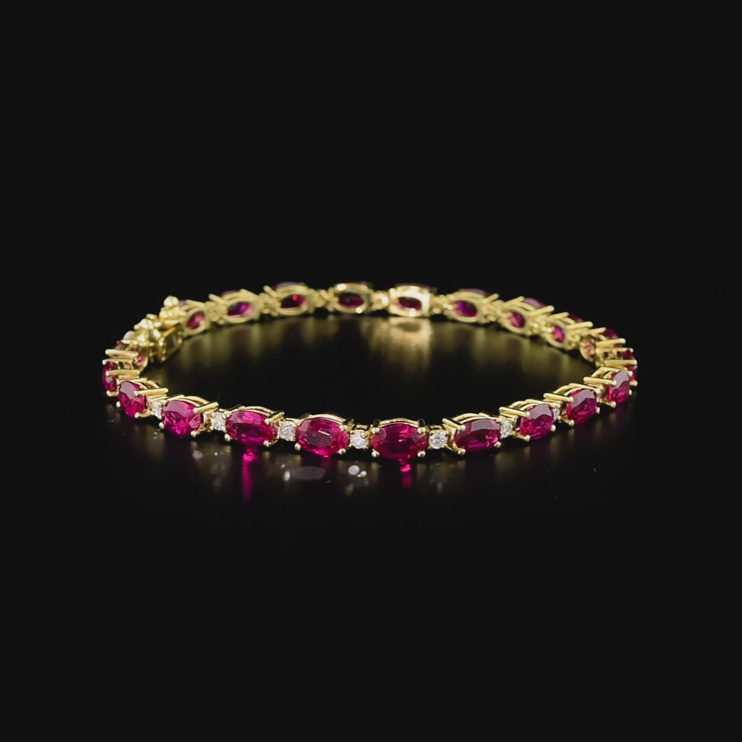 Showcasing richly saturated natural rubies paired with F color, eye-clean natural diamonds, this bracelet delivers a powerful contrast between deep red brilliance and refined diamond sparkle. The harmonious stone arrangement creates a striking yet balanced look, perfect for those who seek confident sophistication with a daily luxury appeal.
