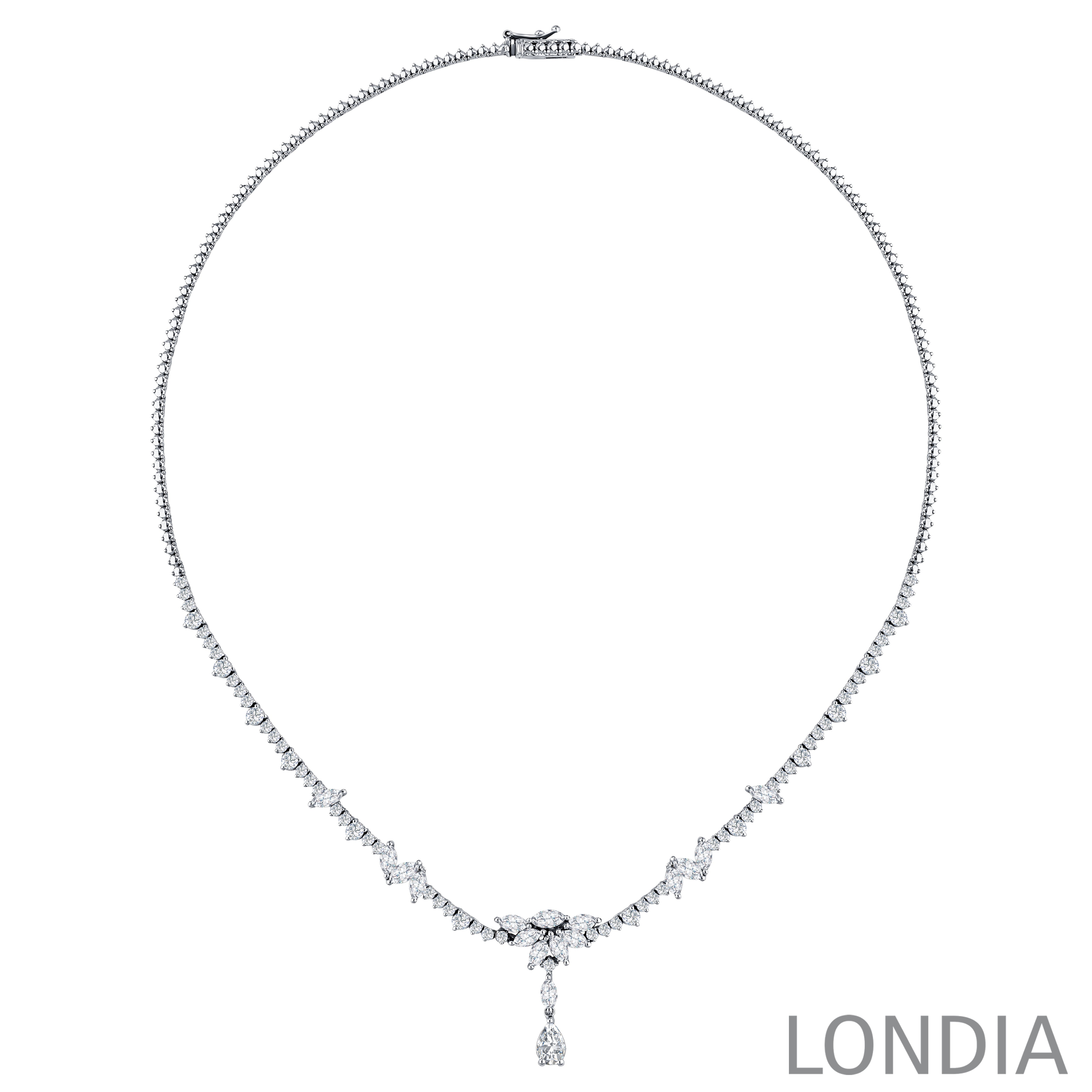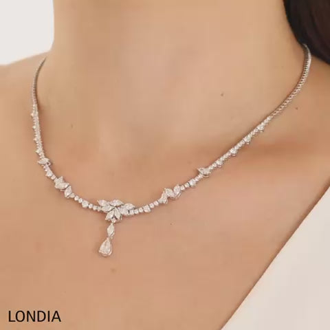 Londia Aurora Diamond Design Necklace, crafted in 18K gold, captures the enchanting glow of the northern lights through its mesmerizing arrangement of pear-cut and round diamonds. Each diamond is meticulously set to reflect a graceful dance of light across the neckline, creating a luminous symphony of brilliance.